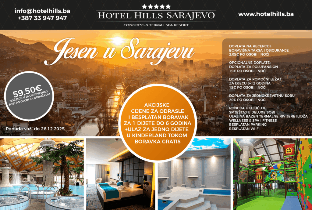 Hotel Hills, Thermal & Spa Resort Sarajevo smješten je u centru zelene oaze Sarajevo Hotel Hills, Thermal & Spa Resort Sarajevo uključuje 330 soba i apartmana, višenamjenski kongresni centar s modernom konferencijskom tehnologijom, Wellness, Spa & Fitness, unutarnji i vanjski bazeni, Adrenalinski park za djecu i odrasle na impresivnih 2200 kvadratnih metara, dvorane za vjenčanja, restorani internacionalne i nacionalne kuhinje, te atraktivan Panoramic restoran i lounge bar na krovu hotela s prekrasnim panoramskim pogledom na zelenom okruženju hotela i grada. Sky bar je otvoren samo za organizirane korporativne zabave, vjenčanja, organizaciju rođendana itd.
